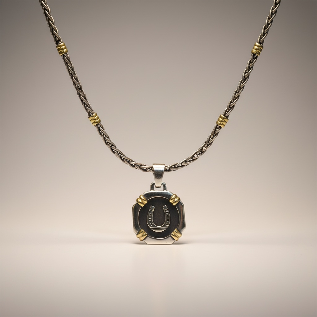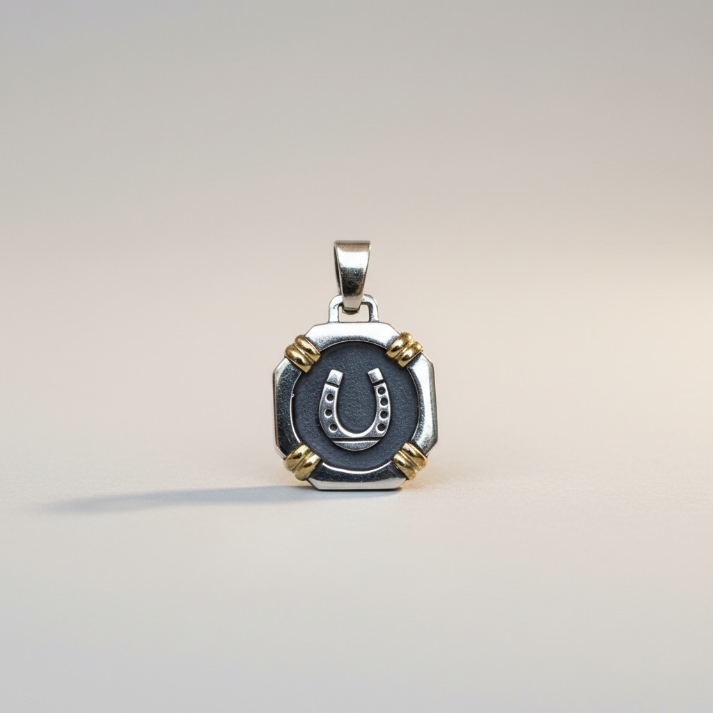 A bold horseshoe pendant in sterling silver with 18k gold accents. Strong, symbolic, and full of character.