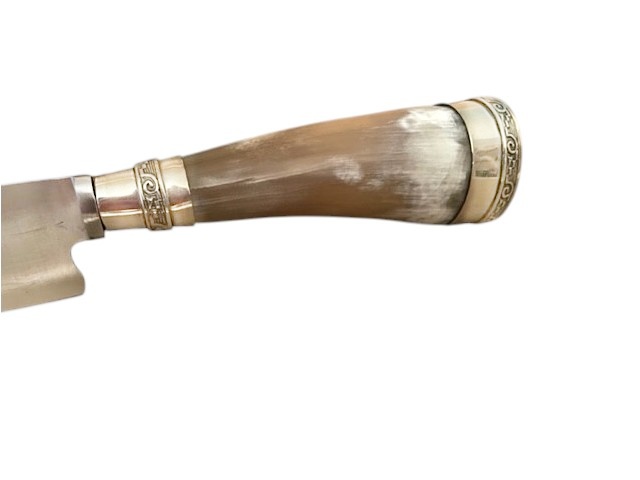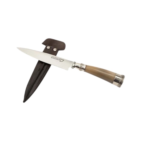 Strikingly handsome, heavy cow horn handles measuring 5” in circumference around the butt end! Tapering to its bolster with alpaca silver adornments are added, to match its butt end. Hand crafted with 20cm ‘Dagger’ brand stainless steel blade which is a full tang blade with thick spine, convex edge and speared tip. An excellent choice for any man’s hand, made with perfect balance and can be used by a right- or left-handed individual.