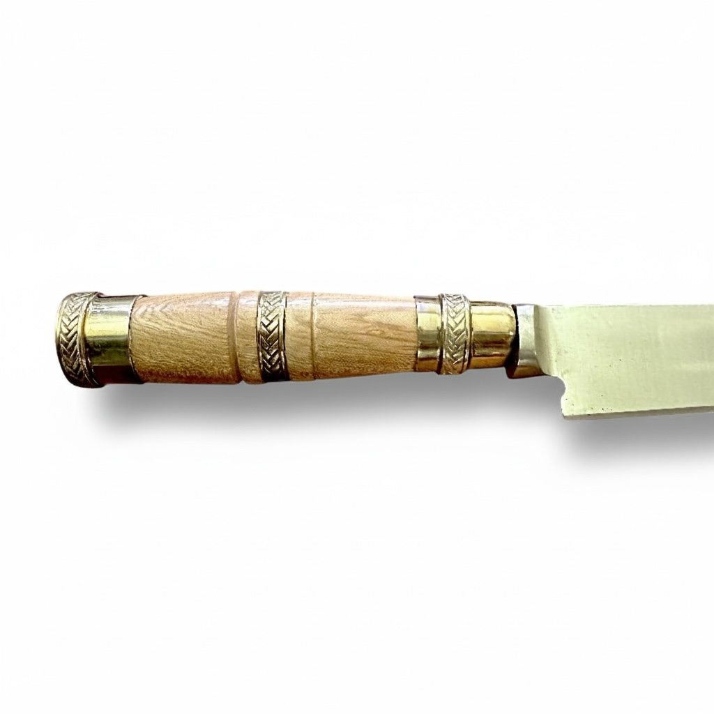 This model celebrates balance — between material, proportion, and restraint. The handle is crafted from carefully selected dark wood or natural blond wood, each chosen for its distinct grain and natural character, making every piece unique.Hand-turned and meticulously polished, the wood is framed by hand-engraved alpaca silver fittings, whose delicate geometric detailing echoes traditional craftsmanship while maintaining a refined, contemporary presence. The transitions between materials are seamless, deliberate, and precise.The blade, forged from high-quality stainless steel, offers clean lines and purposeful weight, designed for both performance and permanence. Nothing here is ornamental without reason; every element exists to endure, to age beautifully, and to be passed on.Features:- Hand-selected dark wood or natural blond wood