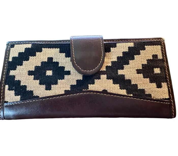 This women’s clutch-style wallet showcases the iconic *Guarda Pampa* hand-loomed fabric in a striking black and khaki pattern. Measuring 7” x 3.5” when closed and 7” x 7” when opened, it combines traditional craftsmanship with modern functionality.