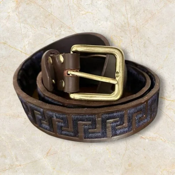 Our handcrafted Argentine polo belt is a timeless accessory that combines tradition, durability, and style. Expert artisans meticulously stitch each belt using thick-cut Argentine harness leather and durable waxed thread, ensuring unmatched quality. This model features the traditional Greek Key pattern, embroidered in rich tan thread on a deep chocolate brown leather strap. Finished with a solid brass buckle, this belt is both elegant and built to last.