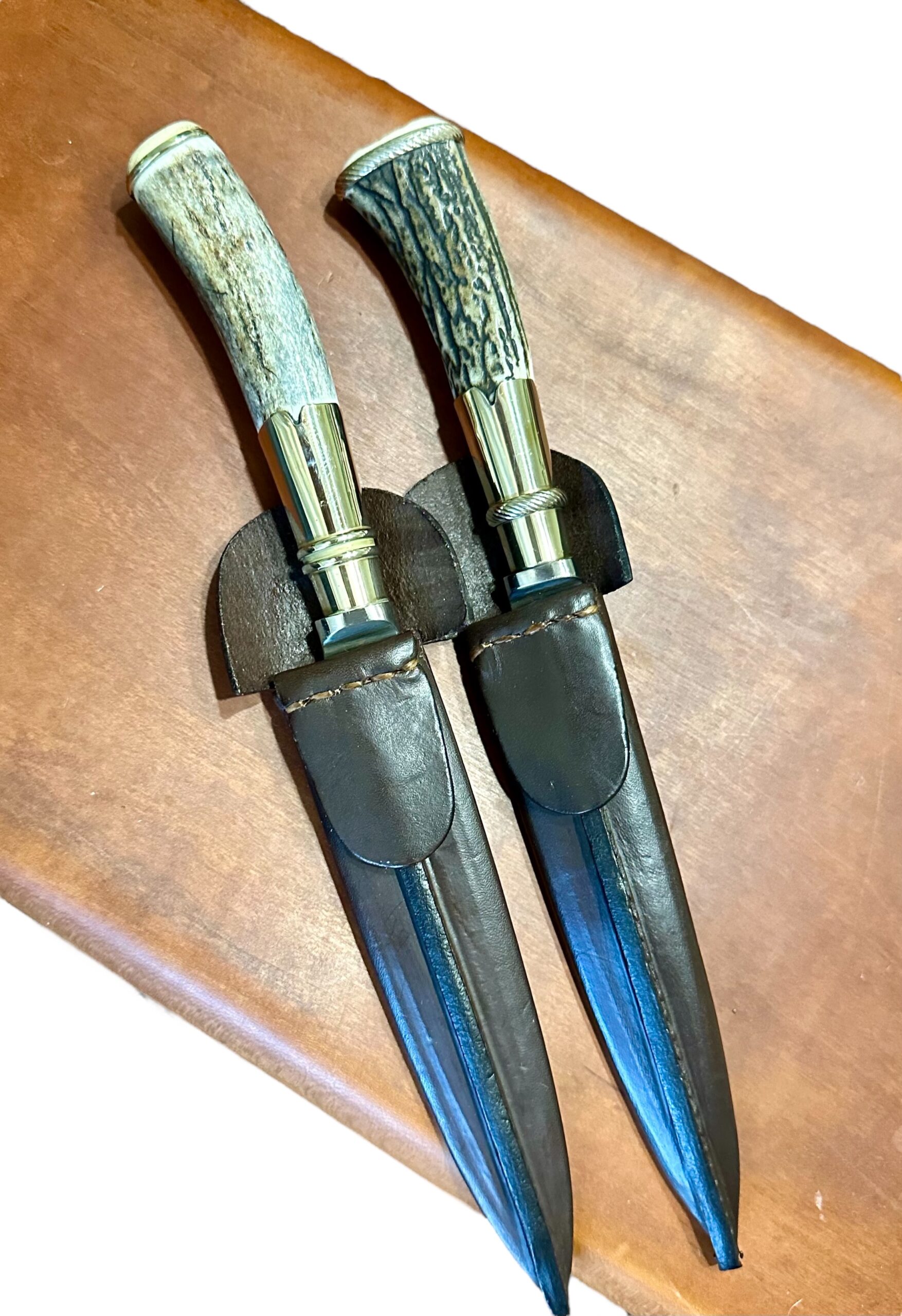 100% Authentic antlered stag horn fixed blade, Gaucho knife, hand crafted from Argentina! 14cm full tang stainless steel Dagger blade with convex edge. Blade measures 14cm – 5.5” with the total length of knife at 26cm – 10.2” from blade tip to butt. Antlered stag horn handle and butt end from authentic Patagonian reindeer from the Andes Mountains of Patagonia. Accented with heavy, decorative alpaca silver , work at bolster and butt end. Hand cut and sown Argentinian cowhide leather scarab with ‘pocket tab’ for keeping and carrying your “Cuchillo” / Gaucho knife. Also available is a 20cm blade size which measures 7.8”! Truly an exquisitely crafted piece of ‘working art’!