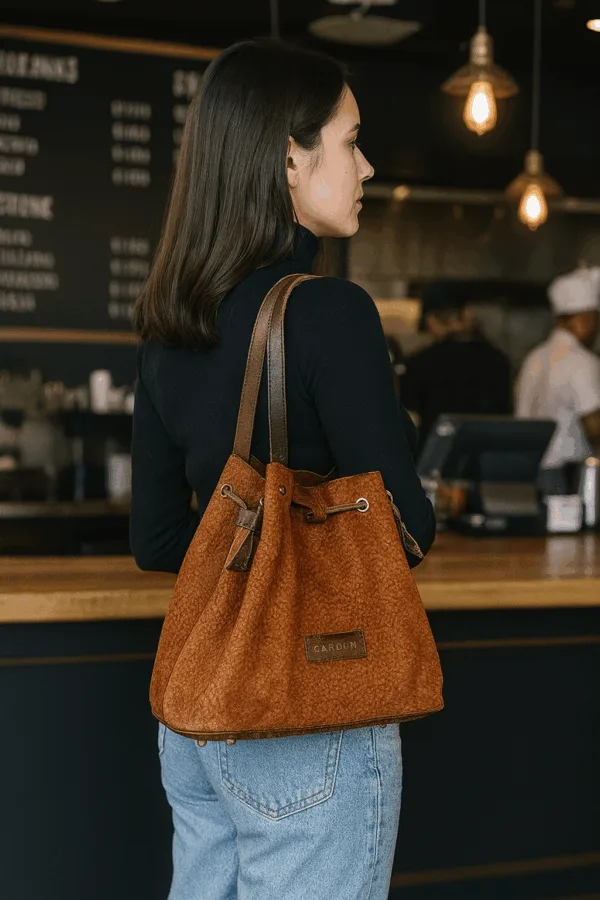 This is a hand-crafted capybara (carpincho) leather shoulder bag. The leather is soft, naturally textured, and each bag has its own unique character. The relaxed drawstring design has no rigid structure, so it drapes beautifully and feels effortless to carry.