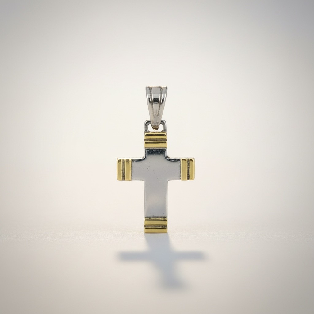 A clean, perfectly balanced cross in sterling silver and 18k gold. Effortless and essential.