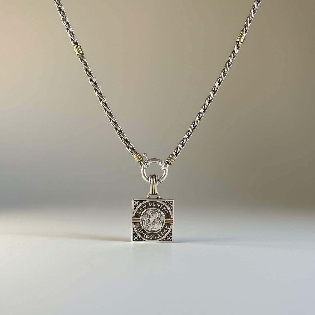 A modern interpretation of the San Benito symbol, crafted in 925 sterling silver with 18k gold accents. Its innovative drop mechanism allows you to slip it onto any chain effortlessly, combining timeless meaning with everyday versatility.