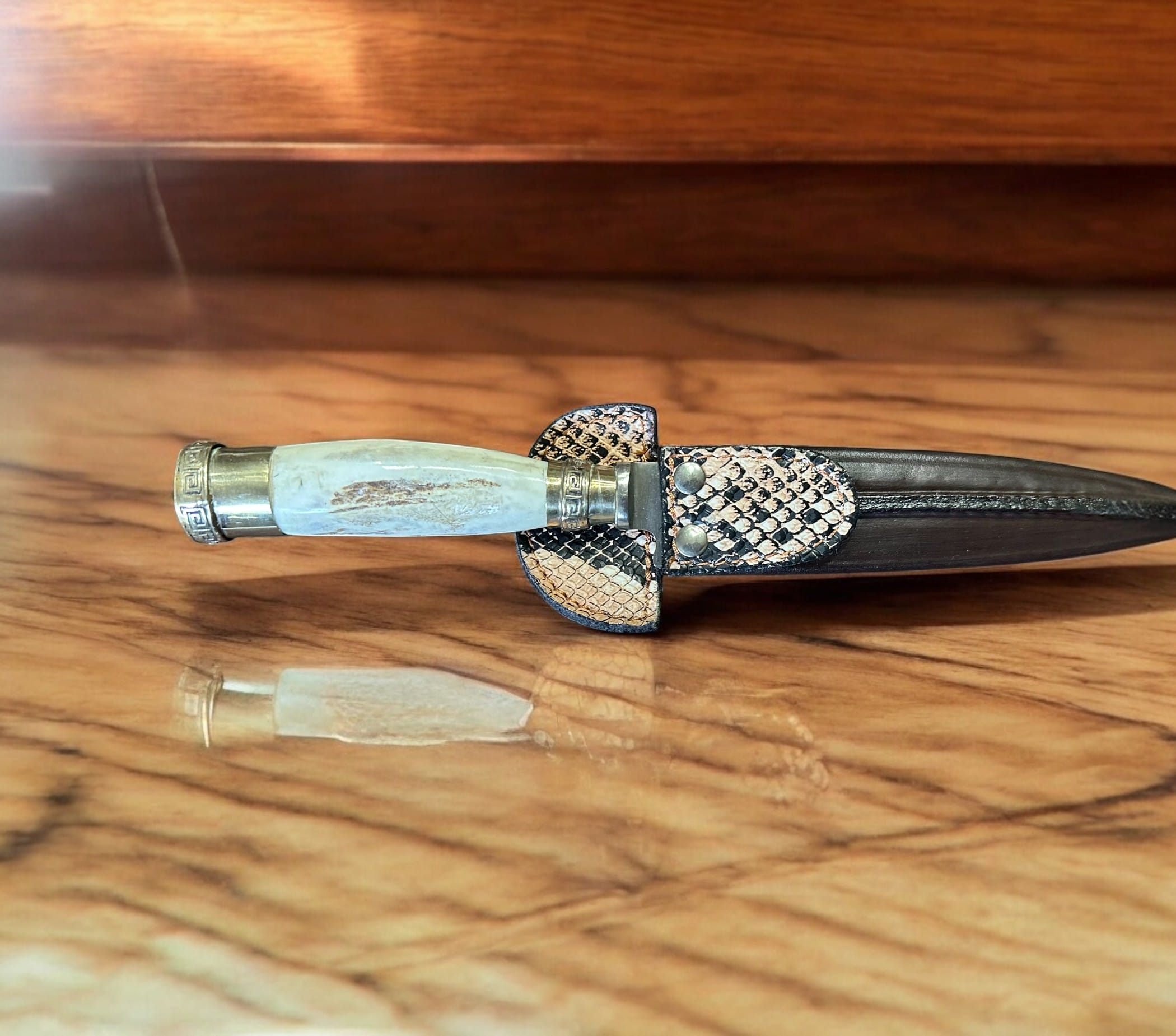 - Sheath: Comes with a unique synthetic leather sheath embossed with a snake pattern for added flair.