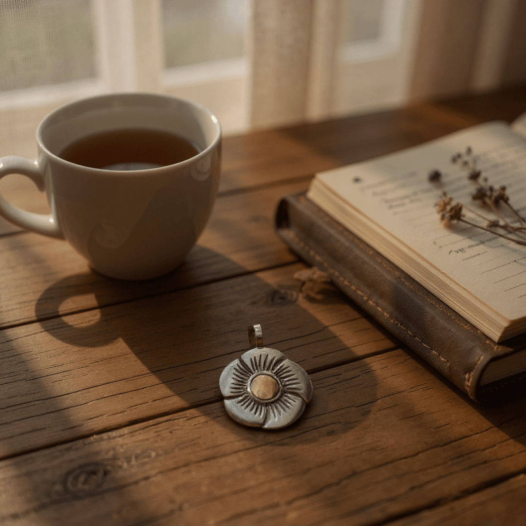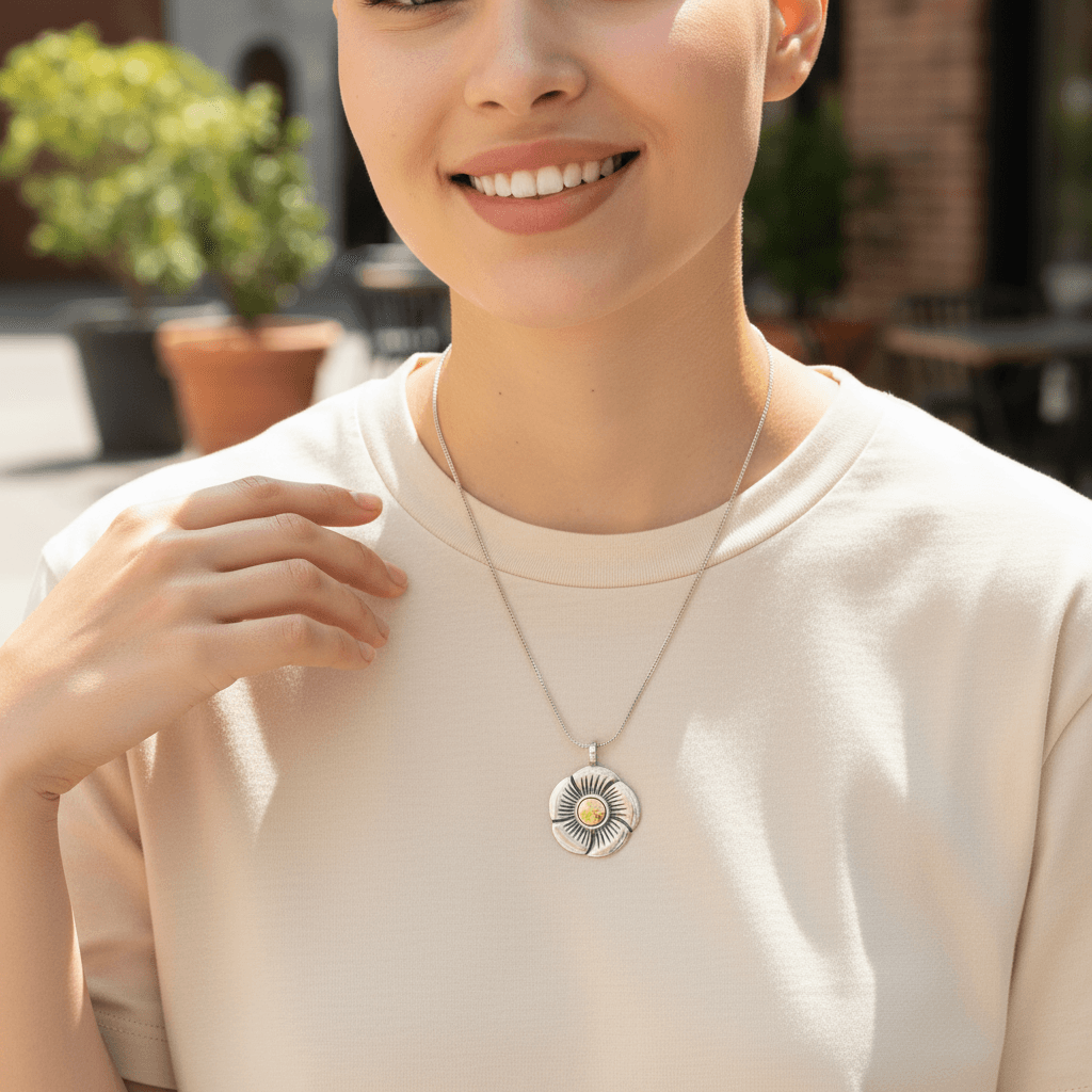 A delicate flower captured in silver and gold. Handcrafted with care, this pendant symbolizes beauty, renewal, and lasting connection—an ideal piece to gift or keep close.